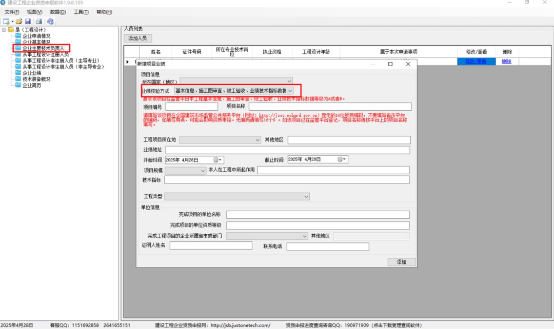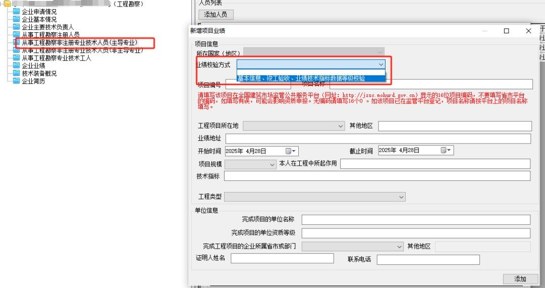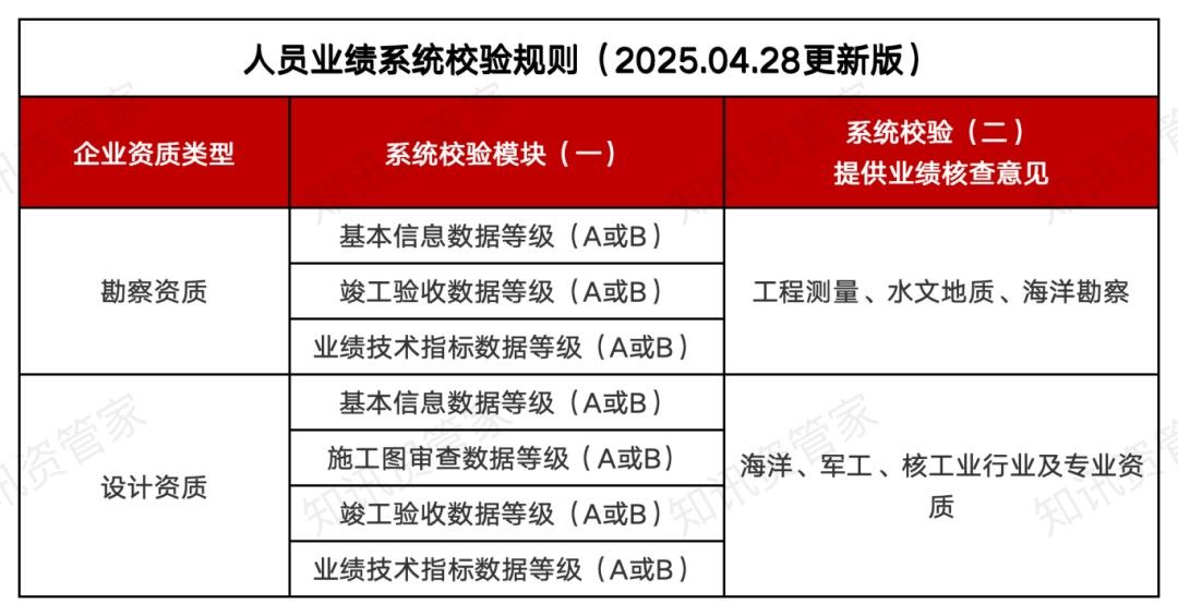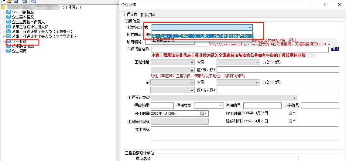 針對4月28日更新的系統(tǒng)顯示,從之前的3種校驗方式調整為2種校驗方式,對于要求平臺業(yè)績的資質類型, 企業(yè)業(yè)績和人員業(yè)績最新的界面要求分別是:
