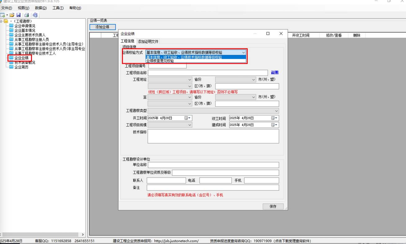 勘察資質3個界面:基本信息,竣工驗收,業(yè)績技術指標